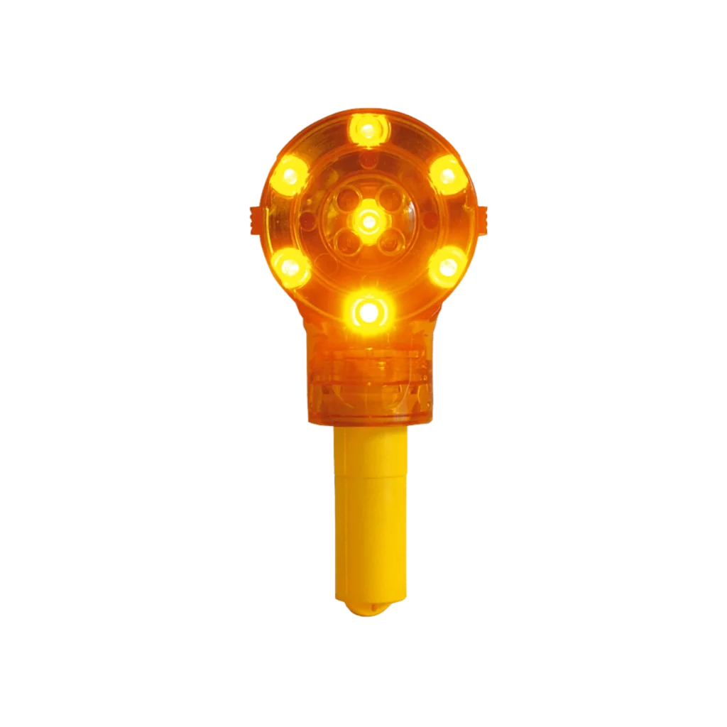 Lampara intermitente de seguridad vial, fabricada en acrílico y ABS, con base de polietileno. Cuenta con 7 leds destellantes color ámbar. Base o mango para insertar en cono o desviador, utiliza dos baterías tipo D